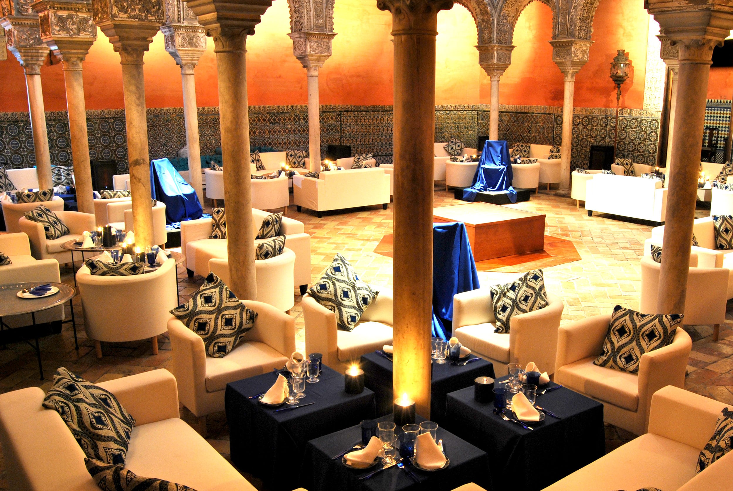 Sevilla es hermosa por fuera y por dentro. Tras gruesos muros de piedra e inmensos portalones de madera de las Indias se oculta el misterio de esta ciudad: patios de inesperado primor, recuerdos de la Roma enamorada del Guadalquivir, leyendas de moras encandiladas, yeserías platerescas, fuentes de aguas que ríen desde hace 500 años, ricos artesonados, jardines celosamente encerrados, columnas que atesoran mil historias. Sevilla es ese rincón privilegiado del mundo donde lo asombroso forma parte del paisaje, y nuestro trabajo llena de encanto ese banquete embrujado que seduce al cliente y al invitado.